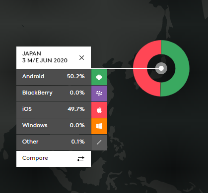 データを見ると、iOS(iPhone)のシェアが49.7%、Androidが50.2%と、日本ではiPhoneとAndroidで二分していることが分かります。