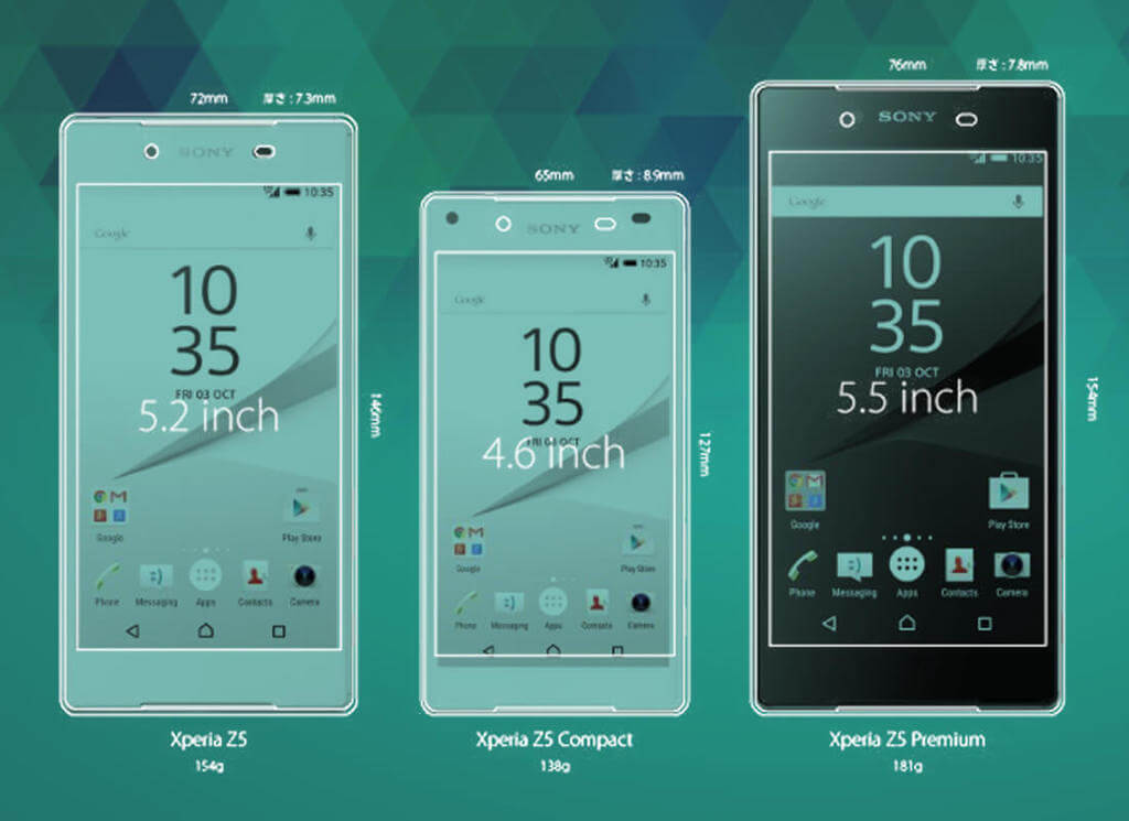 大きさは左から「Z5、Z5 compact、Z5 premium」の順です。